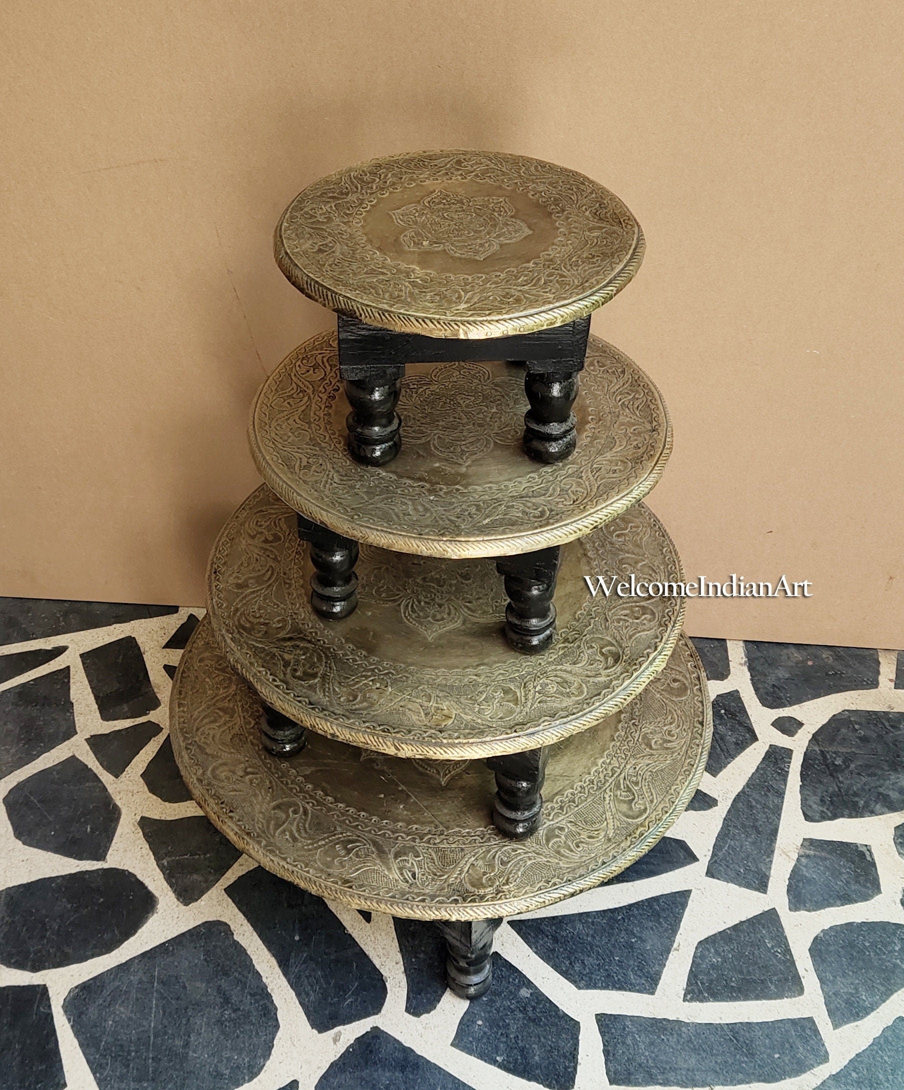 Indian Wooden Brass Fitted Designer Chowki Choki Religious Purpose Beautiful Wood Carved Bajot Hand Painted Stool Set Of 4