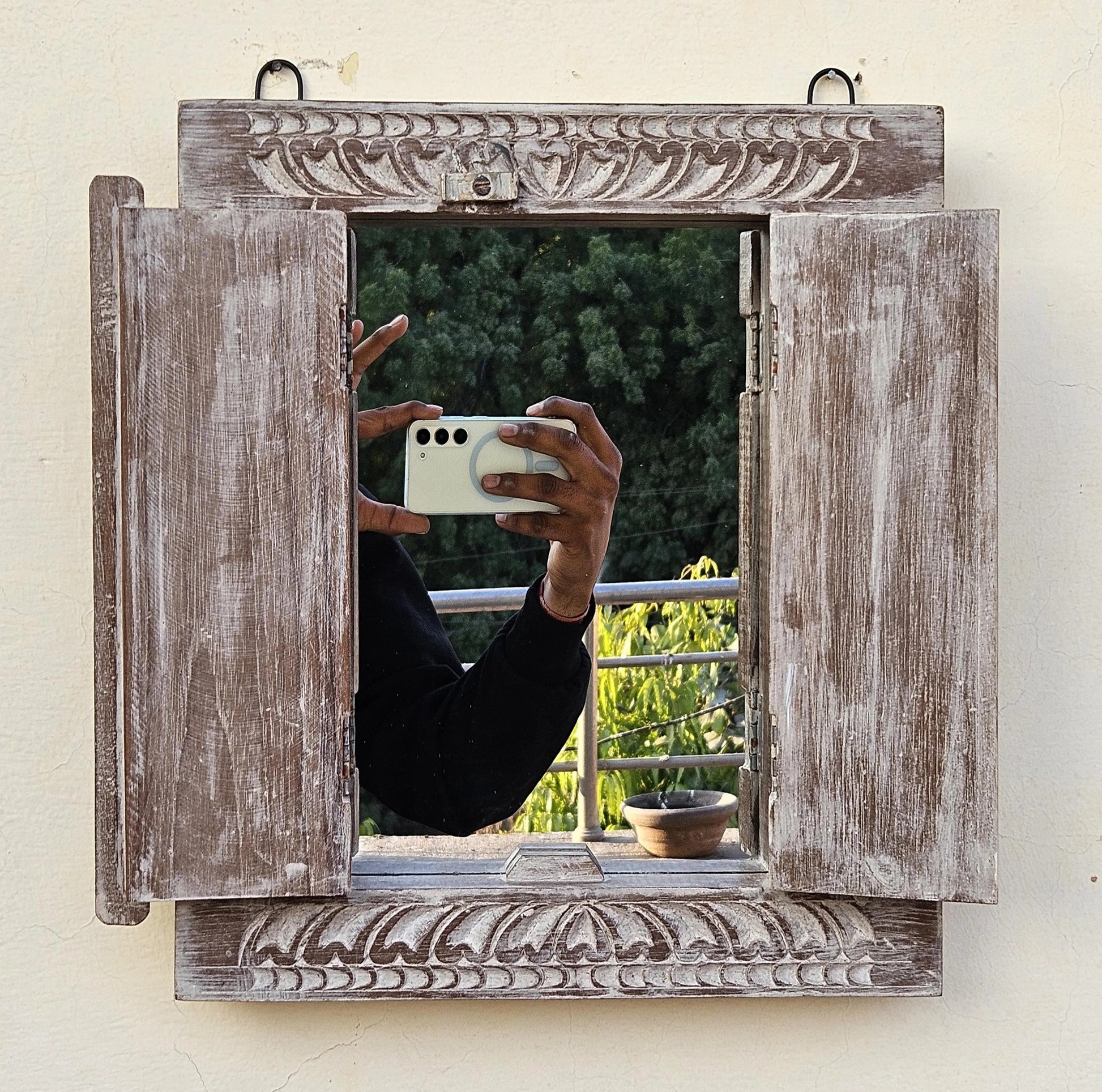 Herringbone Handmade Rustic Teak Wood Window Framed Mirrors Vintage Vanity Mirror Sustainable Wooden Shiplap Floral Carved Window Home Décor