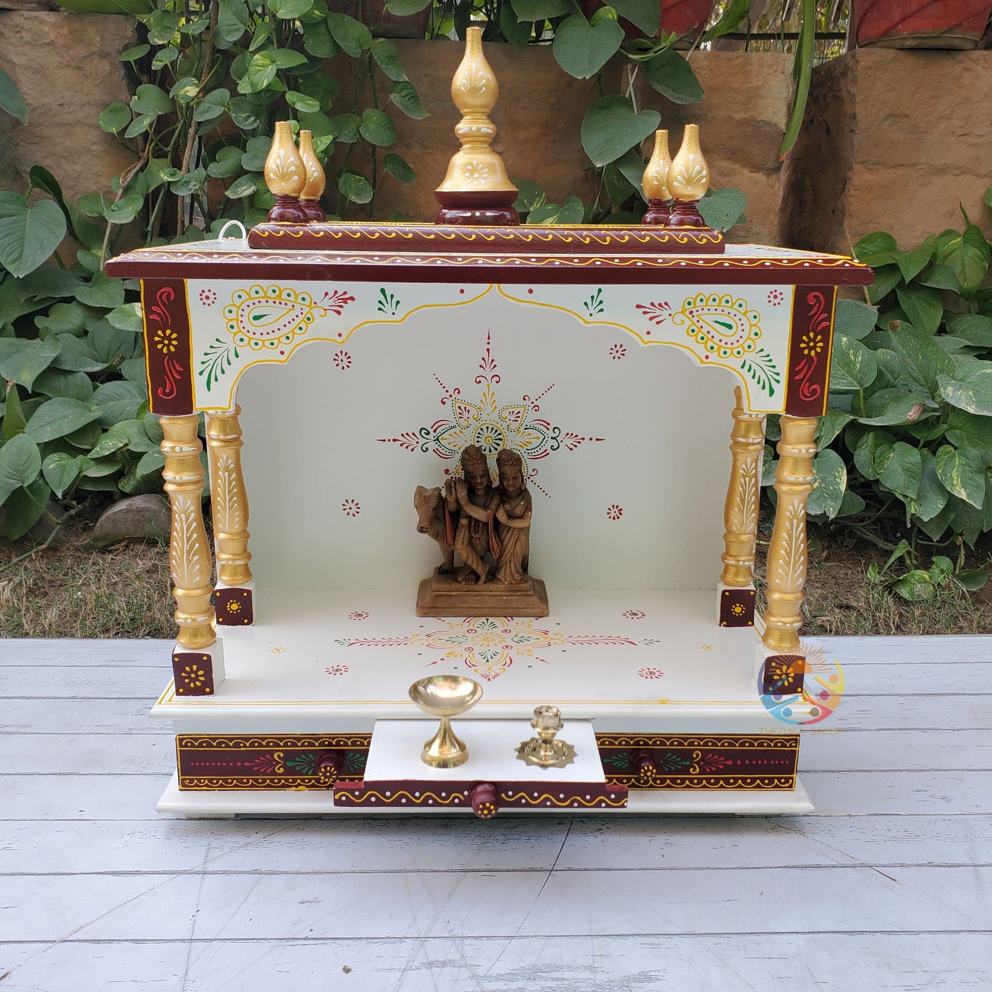 Wooden Mandir Indian Home Temple Store Pooja Altar Hindu Worship Puja Ghar Trendy Mandapam Spiritual Rustic Wall Mandir Sacred Space Stand.
