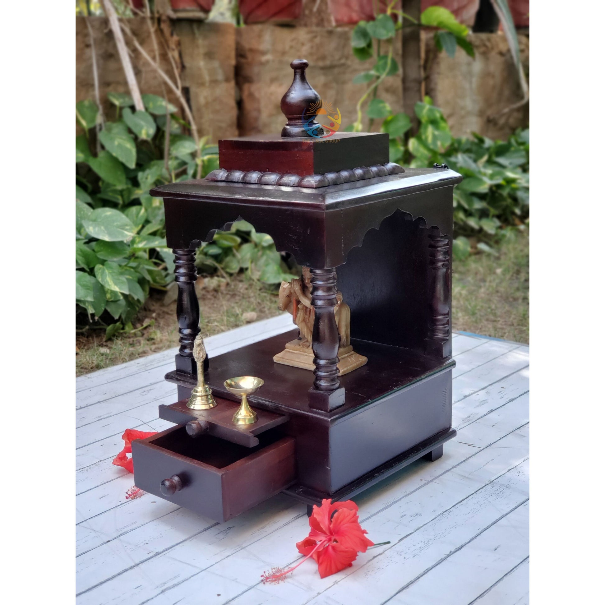 Wooden Temple Mandir Indian Handcrafted Brown Rosewood Pooja Ghar With Religious Gifts Wall Mount Mandap With Drawer For Home Office Decor