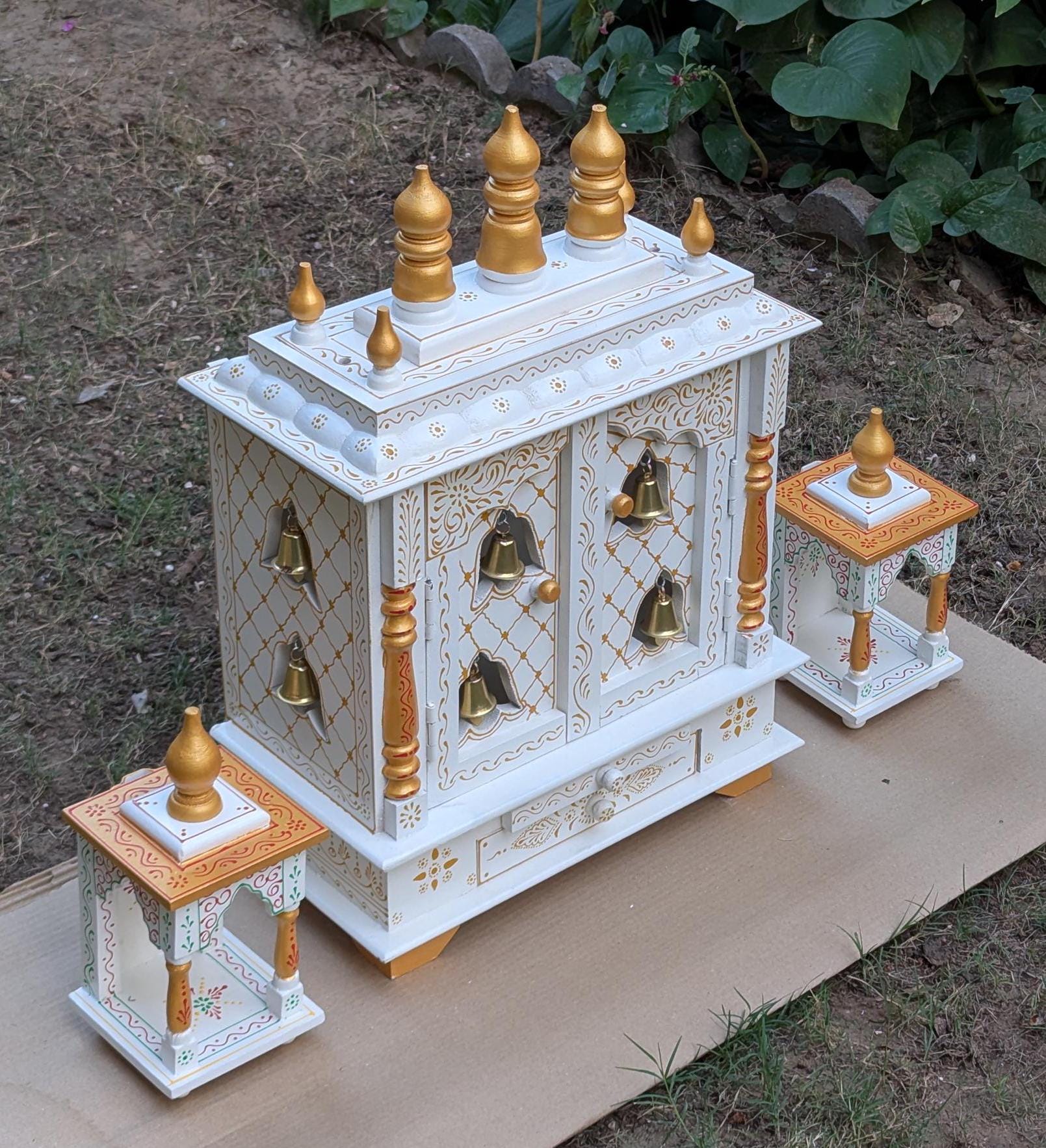 Comes with 2 small temples measuring 4.5x4.5x9.5 inches each. The front features two golden bells on each door that add a serene sound to your worship.