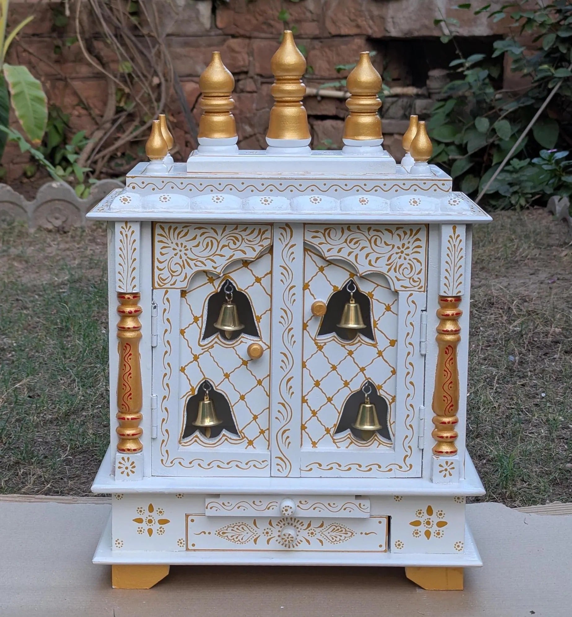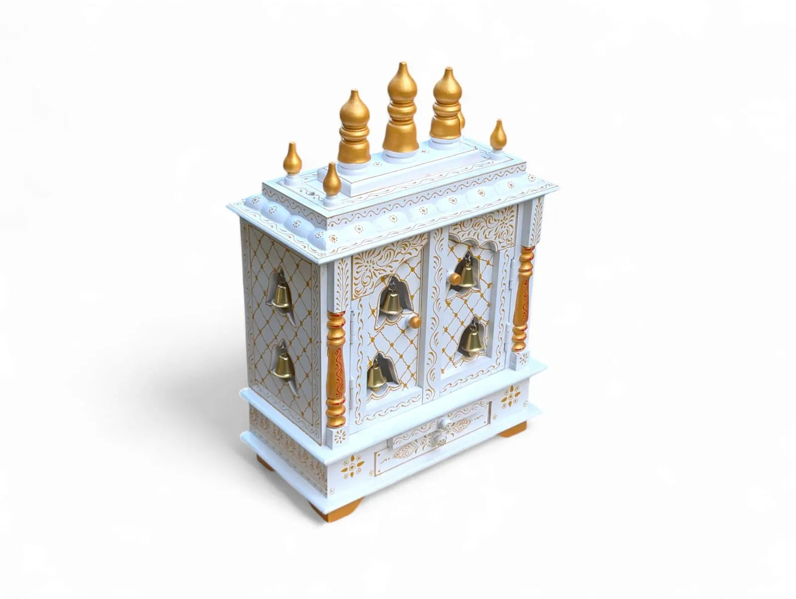 Wooden Temple With Golden Bells Elegant Handmade Wooden Pooja Mandir With Door Cabinet Sustainable Hindu Temple for Home & Office Worship