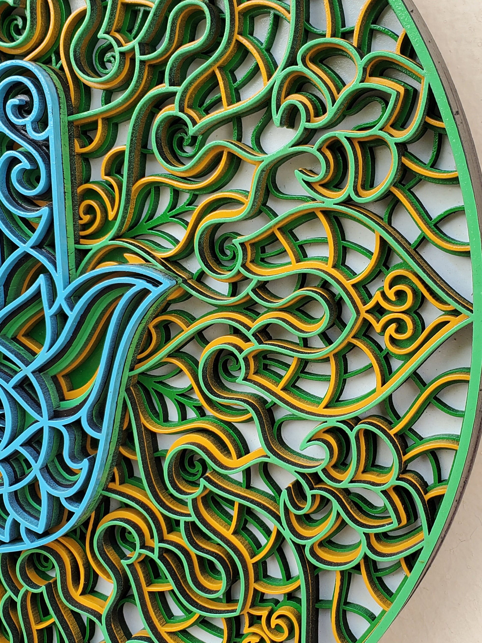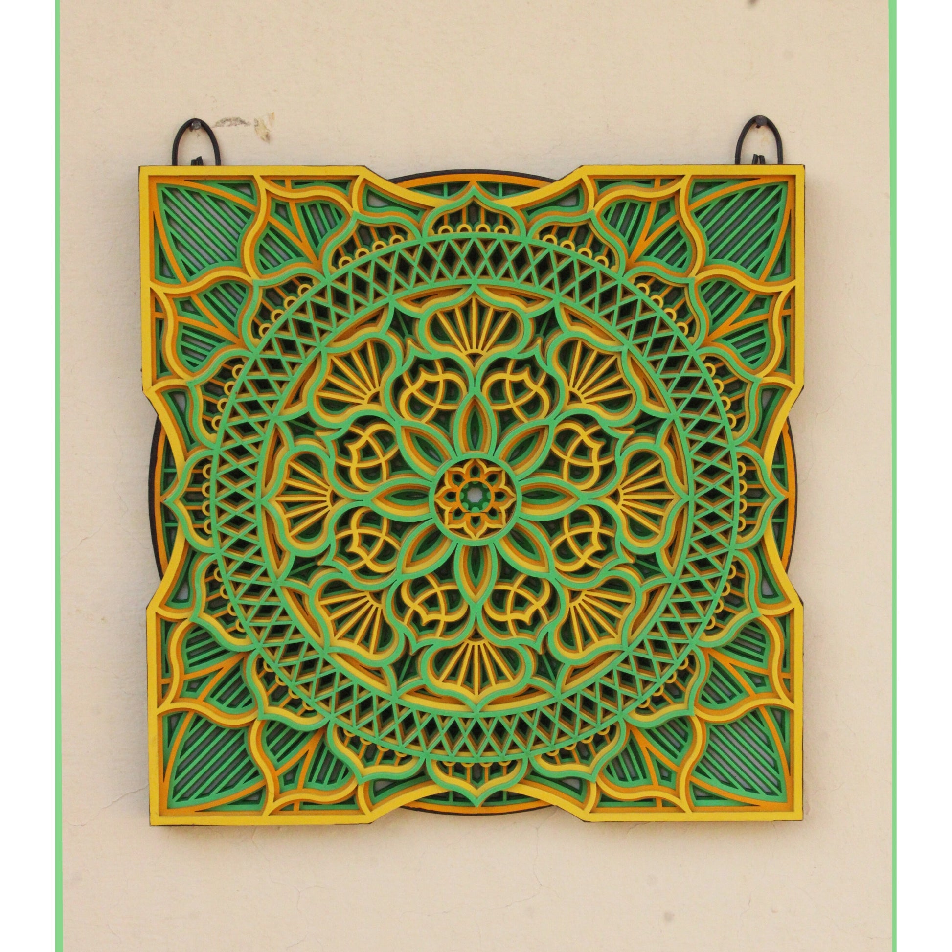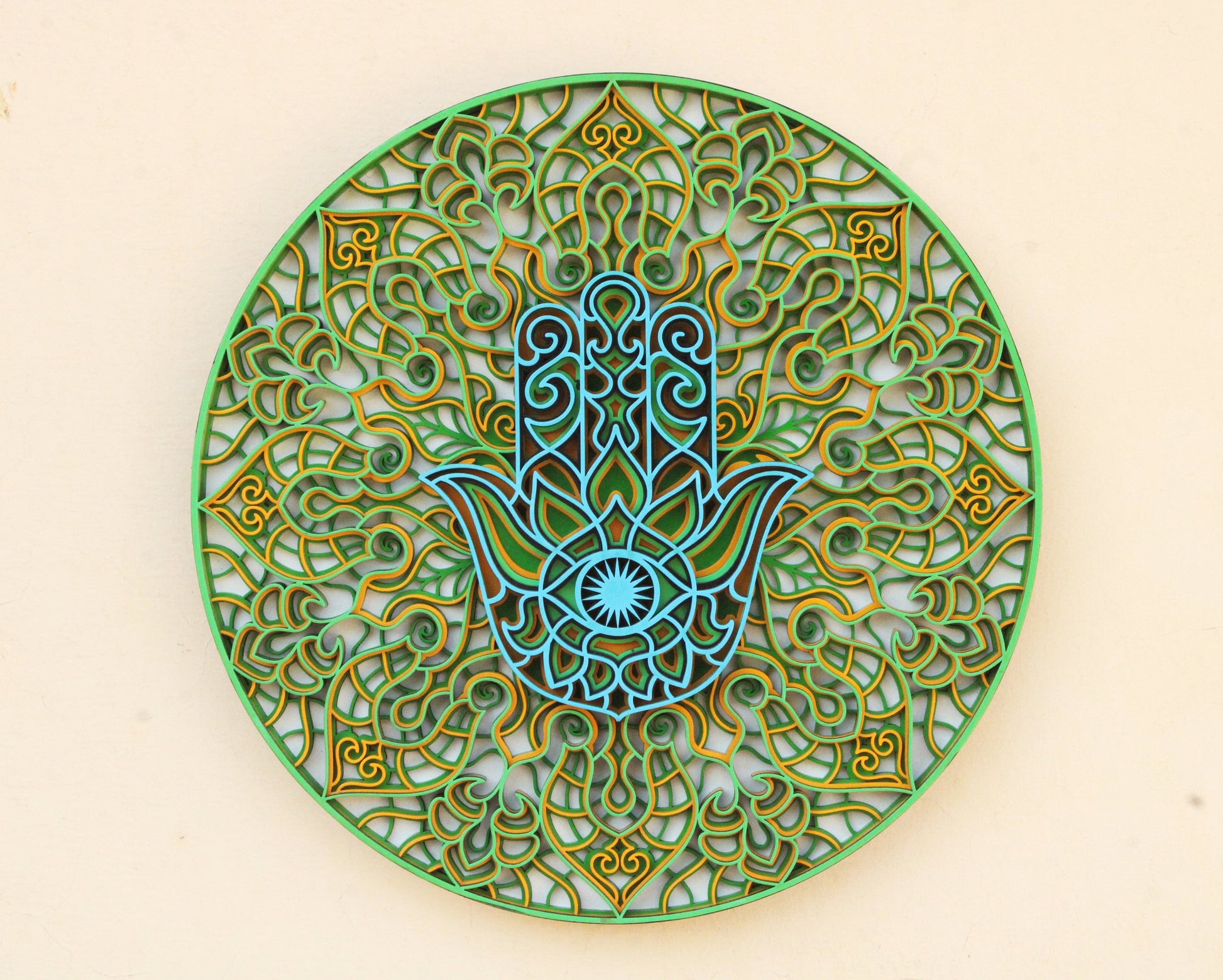 Lucky Hamza Hand of Fatima Evil Eye Wall Decor Arabic Holy Symbol Multi Layers Round Mandala Flower Decor Multi Colour Wood Wall Hanging-3D