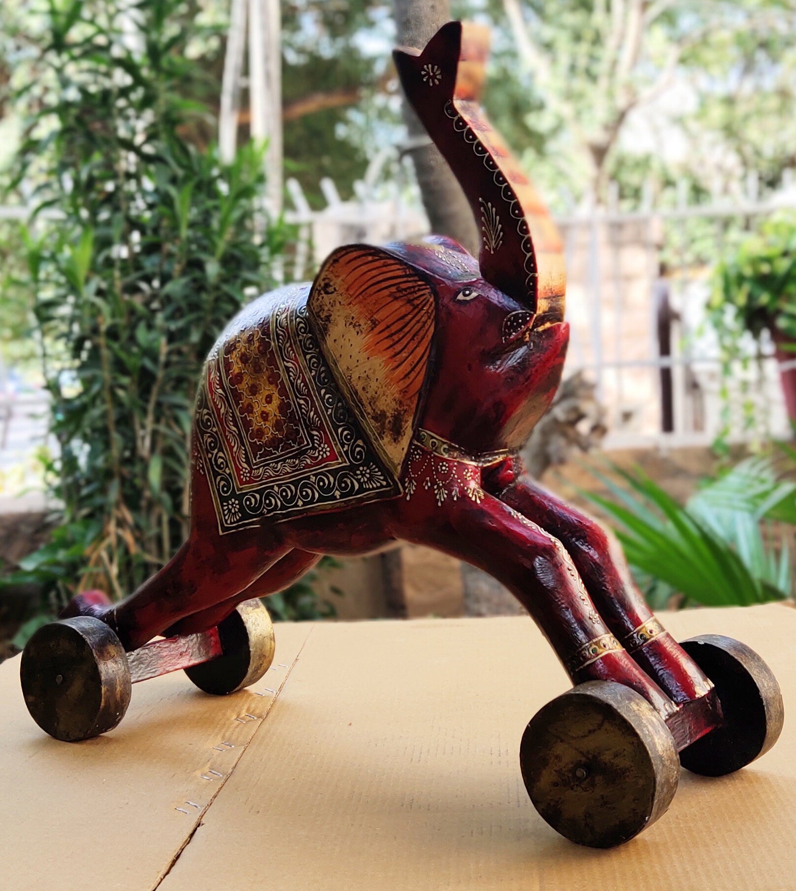 Old Recycled Wooden Elephant Artisan Figurines Hand Painted Elephant With Wheel Statue Unique Housewarming Gift Old Indian Collectible Art