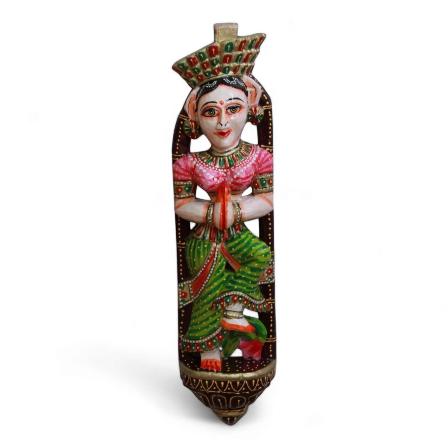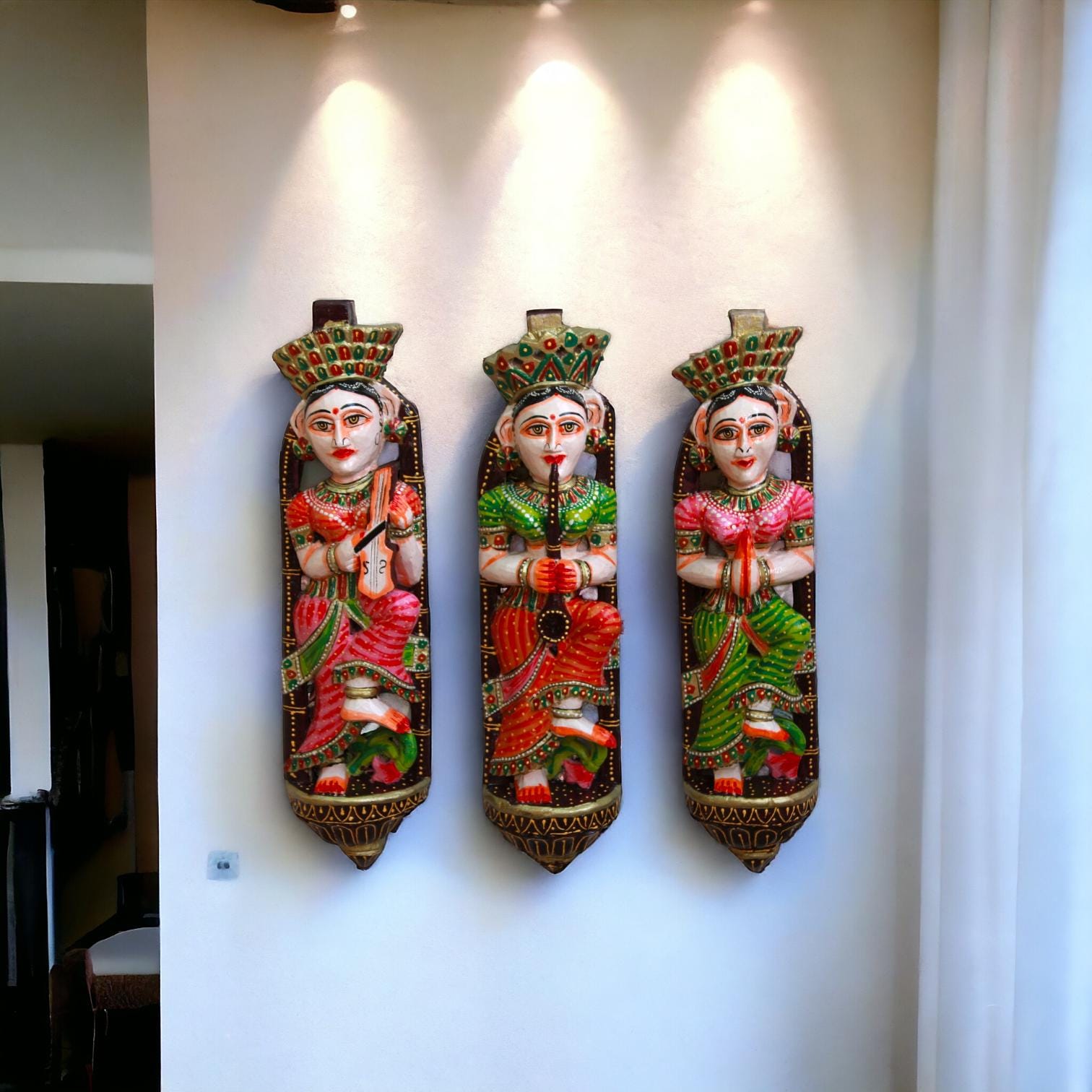 Add a touch of cultural elegance to your home with this exquisite set of 3 hand-painted wooden lady musician wall hangings. These traditional Indian folk art pieces are meticulously crafted from high-quality solid wood and feature intricate details showcasing vibrant colours and classic musical instruments. Measuring 12.5 x 8 x 53 CM (LWH), they make for stunning wall decor in living rooms, offices, entryways or as gifts for art enthusiasts.